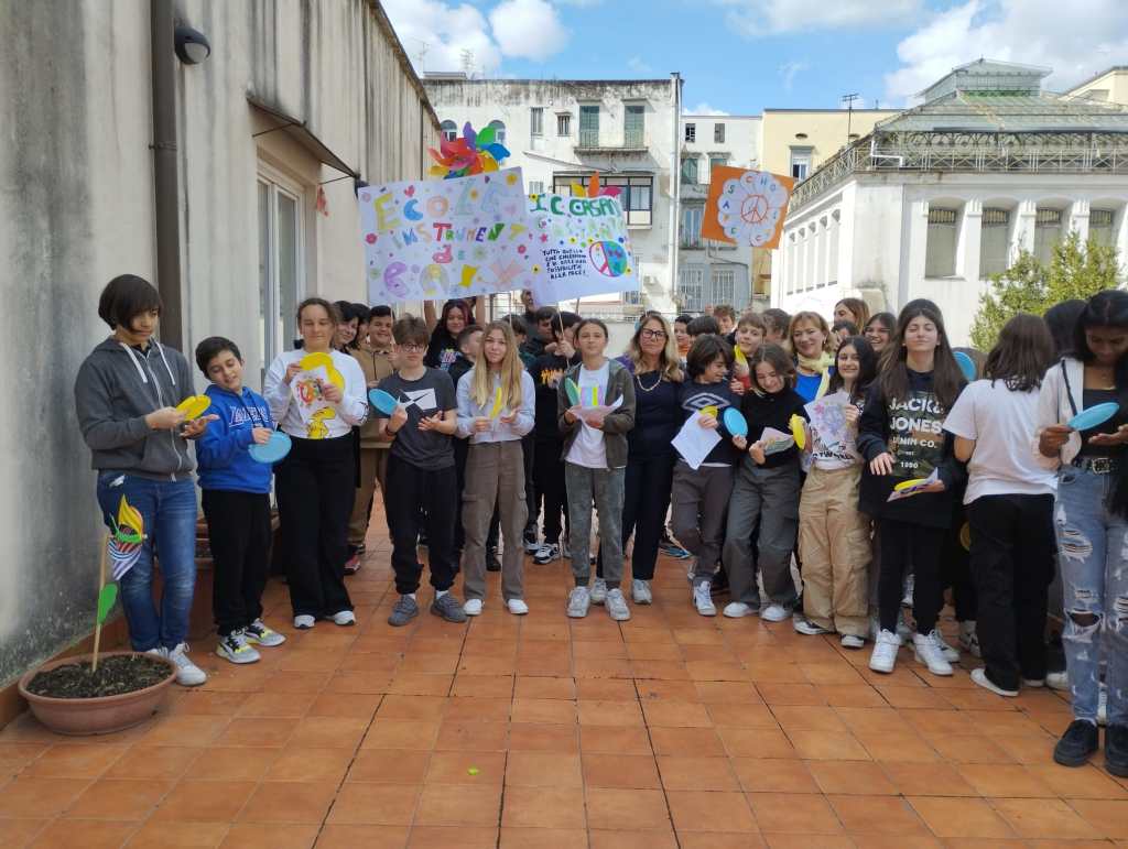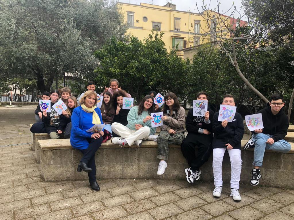 Abbiamo potuto così ascoltare l’orchestra e una poesia recitata in francese da alunni dell’IC Minucci, i canti, le poesie e le profonde riflessioni delle scuole primarie S.Ignazio da Loyola e Pavese , i fiati della Musto-Nazareth, le canzoni e gli appelli del Liceo Vittorini, accompagnati da applausi di una classe del Liceo Mazzini. Il finale è stato affidato ai percussionisti della D’Ovidio-Nicolardi, che hanno fatto scatenare anche danze e girotondi. Insomma una bellissima mattinata, una folla allegra, colorata e pacifica, un’esperienza straordinaria, che noi di EIP Campania abbiamo volentieri dedicato alla Pace!