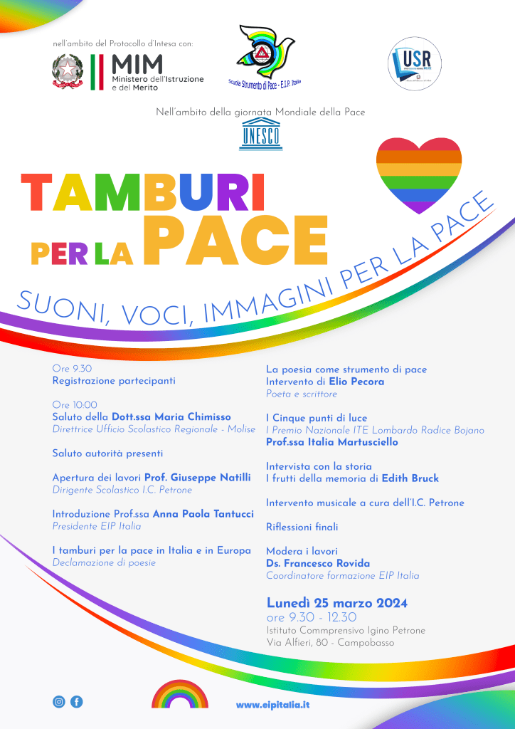 I delegati e la Vice Presidente hanno messo in cantiere questo percorso formativo Tamburi per la pace – Suoni, Voci, Immagini per la pace! , seguendo le indicazioni del Presidente Nazionale EIP, Anna Paola Tantucci, per offrire ai discenti: