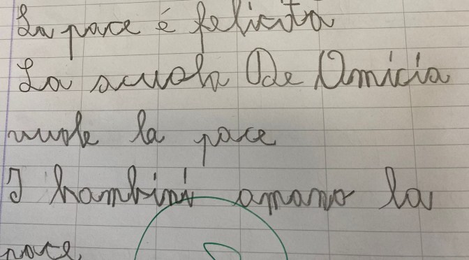 Ciascun gruppo è stato accolto dalla Dirigente che ha spiegato loro il significato e le motivazioni profonde dell’iniziativa anche per i più piccini, soprattutto in un momento storico così drammaticamente segnato da guerre e violenza. Non ha, però, mancato di lanciare un messaggio di speranza, accennando al tavolo di mediazione tenuto da diverse potenze mondiali appena il giorno precedente, per il raggiungimento di un accordo di pace.