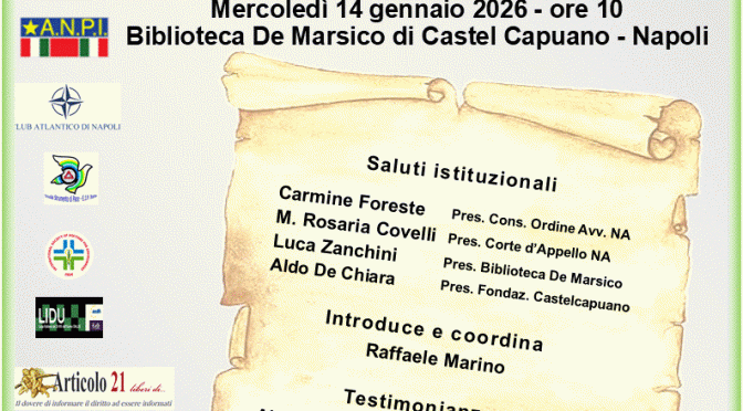 Interverranno Carmine Foreste (Presidente del Consiglio dell’Ordine degli Avvocati di Napoli), M. Rosaria Covelli (Presidente della Corte d’Appello di Napoli), Luca Zanchini (Presidente della Biblioteca De Marsico) e Aldo De Chiara (Presidente della Fondazione Castelcapuano).