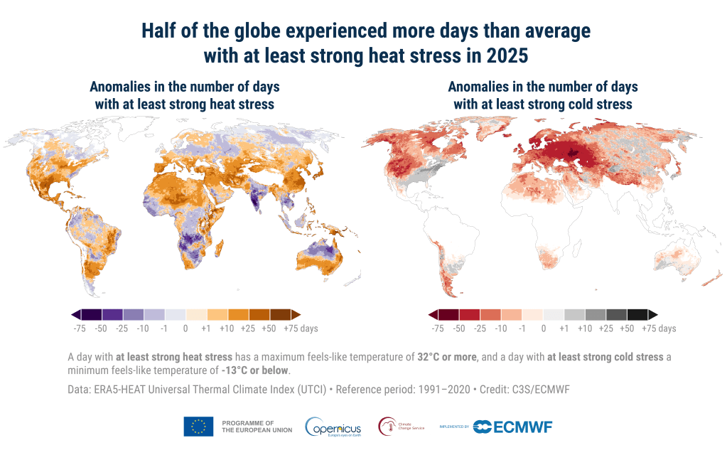 Anche per il continente europeo, il 2025 è stato il terzo anno più caldo, con una temperatura superiore di 1.17°C alla media 1991-2020. In particolare, il mese di marzo 2025 è stato il più caldo mai registrato in Europa. A livello globale, il calore ha avuto impatti diretti sulla popolazione: il 50% delle terre emerse ha sperimentato un numero di giorni superiore alla media con stress termico forte (temperatura percepita pari o superiore a 32°C).