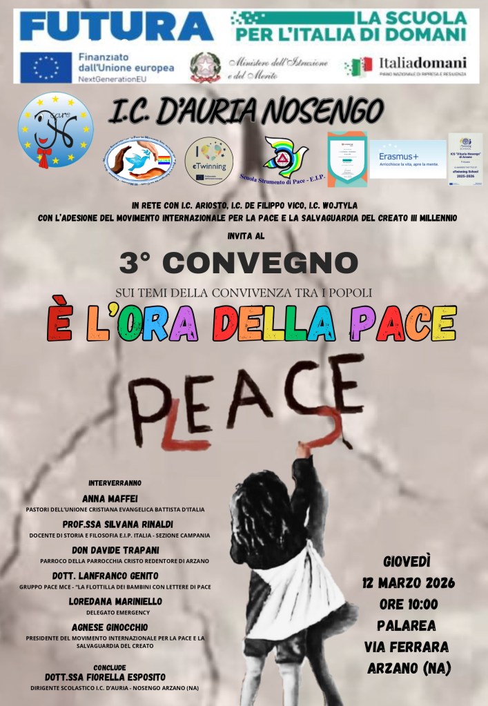 Il prossimo giovedì 12 marzo 2026, alle ore 10:00, il Palarea di Arzano ospiterà una riflessione globale ospitando il 3° Convegno sui temi della convivenza tra i popoli intitolato “E’ l’ora della Pace”. L’evento è promosso dall’Istituto Comprensivo “D’Auria-Nosengo” di Arzano, guidato dalla Dirigente scolastico Fiorella Esposito, in rete con gli Istituti Comprensivi “Ariosto”, “De Filippo Vico” e “Wojtyla” e con l’adesione del Movimento Internazionale per la Pace e la Salvaguardia del Creato.