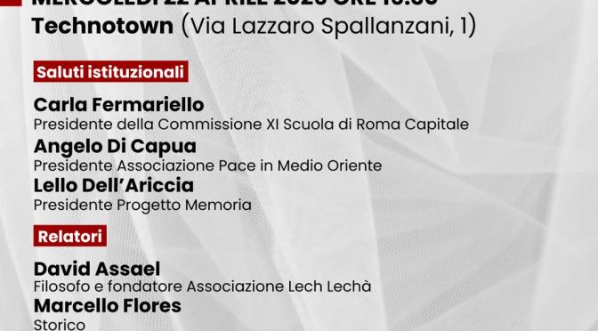 Il convegno, moderato da Roberto Reali (Consiglio Direttivo Associazione Pace in Medio Oriente), si aprirà con i saluti istituzionali di Carla Fermariello (Presidente della Commissione XI Scuola di Roma Capitale), Angelo Di Capua (Presidente dell’Associazione Pace in Medio Oriente) e Lello Dell’Ariccia (Presidente del Progetto Memoria).