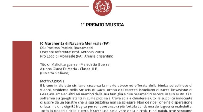 Il brano “Maliditta Guerra”, vincitore del Premio nazionale “Salva la tua lingua locale”, la cui cerimonia di premiazione si è svolta la mattina del 27 aprile nella solenne cornice dell’Aula Giulio Cesare in Campidoglio, è una toccante e profonda denuncia degli effetti devastanti che i conflitti armati hanno sulle popolazioni civili, in particolare in Palestina. Utilizzando la forza espressiva del dialetto siciliano, la canzone compie un delicato lavoro di memoria, trasformando una vicenda reale e drammatica in una testimonianza universale.