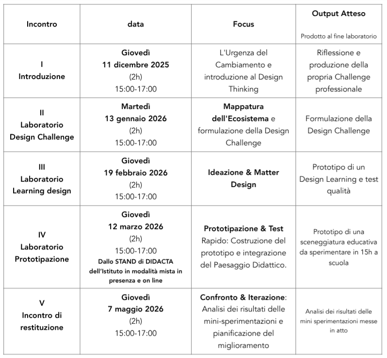 Il percorso formativo si svolge in modalità teleconferenza tramite l’applicazione Google Meet ed è strutturato in 8 incontri della durata di 2 ore ciascuno, per un totale di 16 ore.